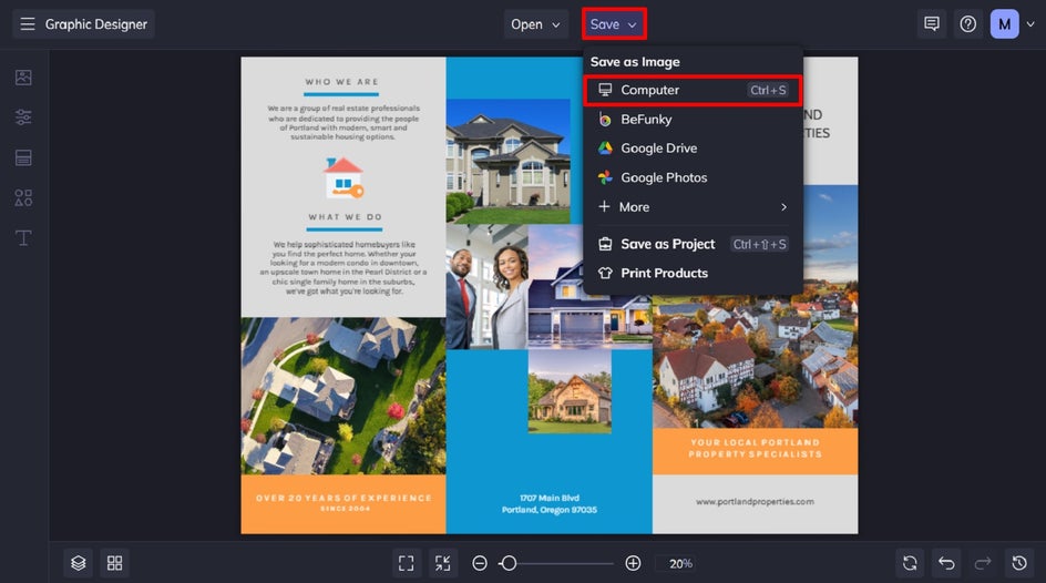 Once your design is complete, click Save at the top of the page. For print-ready materials, choose PDF > Print for the best quality. You can also download your brochure as an image file or PDF to send via email or share digitally with clients.