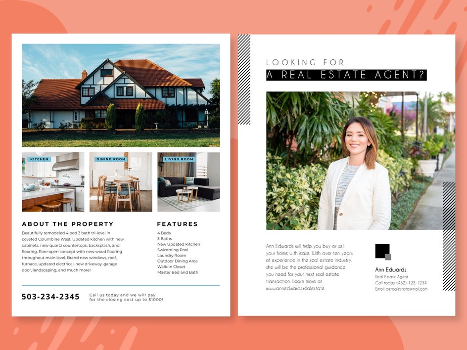 Click on any text box to type in your own copy – like listing price, specs, or other descriptive property details. Additionally, make sure your name, agency, phone number, email, and website are clearly visible.