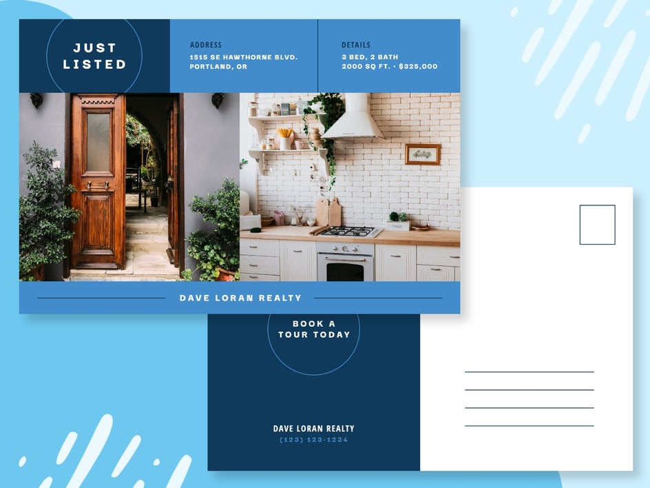 Use BeFunky’s Postcard Maker to design mailers that introduce new listings or keep you top-of-mind in a specific neighborhood. Real estate postcards are also great for client thank-you notes or sending seasonal messages.