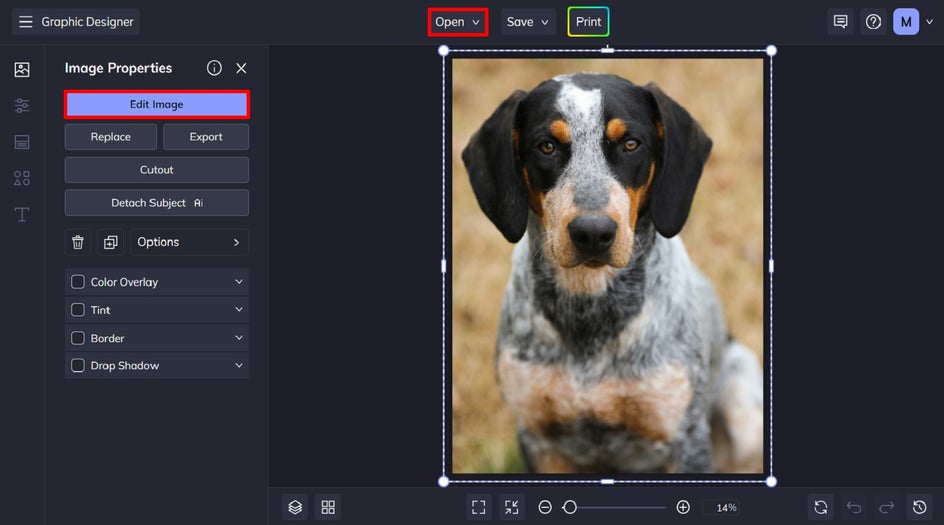 To create a personalized pet portrait, head to the Graphic Designer. Open your pet photo by clicking Open > Image. Then, follow these 4 steps!