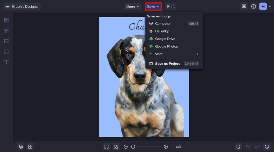 Once you’ve finished editing your digital pet portrait, click the Save button at the top of the page, then select your desired save location and file type.