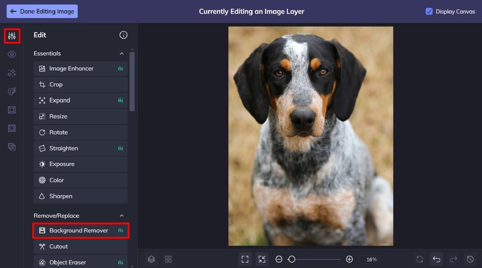 First, we’re going to replace the existing background in your pet image with a solid color. To do this, click on Background Remover in the Edit menu.