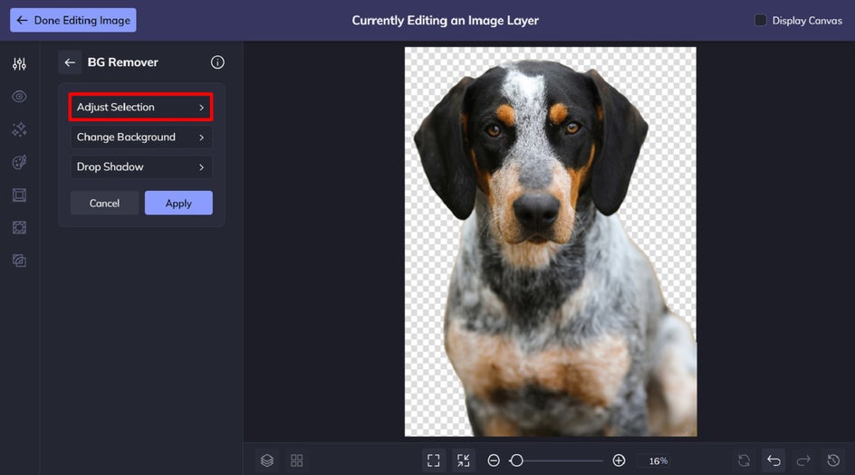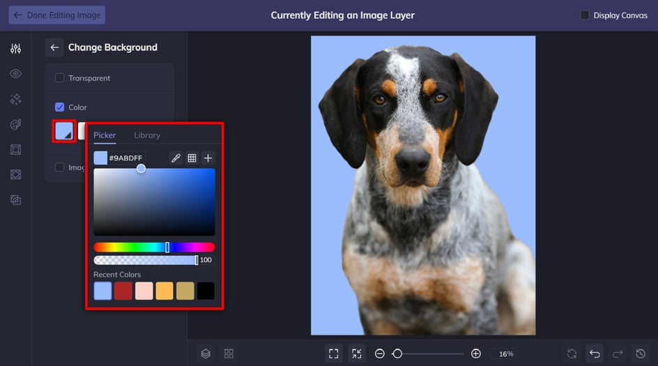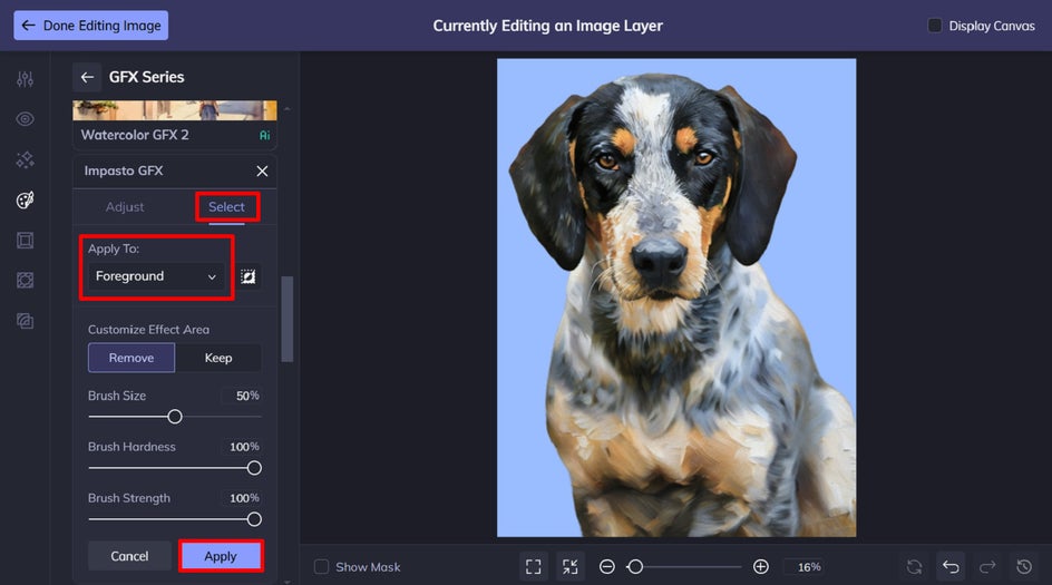 The most important part of this step, however, is that you only apply your painting effect to your pet and not the colored background. To do this, click on the Select tab. Then, underneath “Apply to:” select Foreground. Finally, click Apply, before clicking Done Editing Image in the top-left corner.