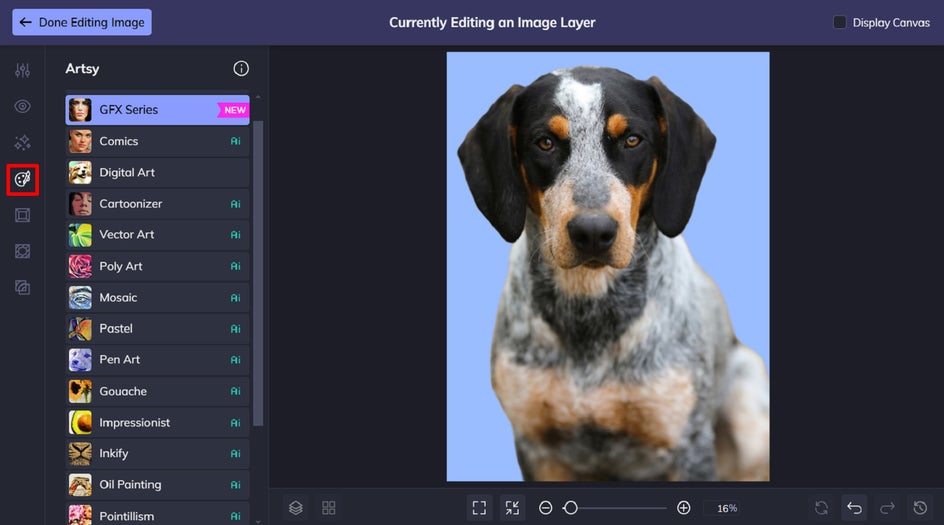 With your pet photo’s new colored background in place, it’s now time to add a painting effect to your pet. Click Artsy in the main menu on the left, then select the painting style category you wish to use.