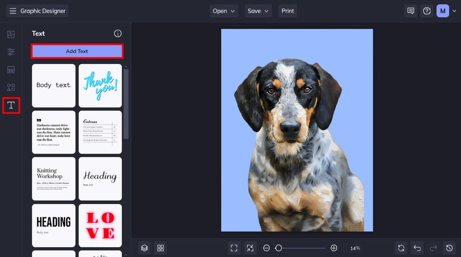 Once back within the Graphic Designer, it’s time to add your pet’s name to your painting. Click Text in the main menu on the left, followed by Add Text.