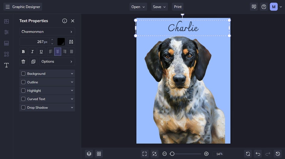 Double-click the textbox and type your pet’s name (or anything else you want your pet painting to contain). Any time you have a textbox selected, a Text Properties menu will appear on the left. This is where you’re able to change the font, font color, letter spacing, typographical emphasis, and so much more.