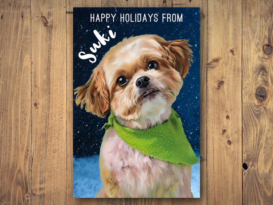 Why not create a festive pet portrait by choosing seasonal colors or patterns for the background, like red and green for Christmas or pastels for Easter? You could even add text with a holiday greeting, like “Happy Holidays from [Pet’s Name]!” This makes a perfect custom holiday card or gift for family and friends.