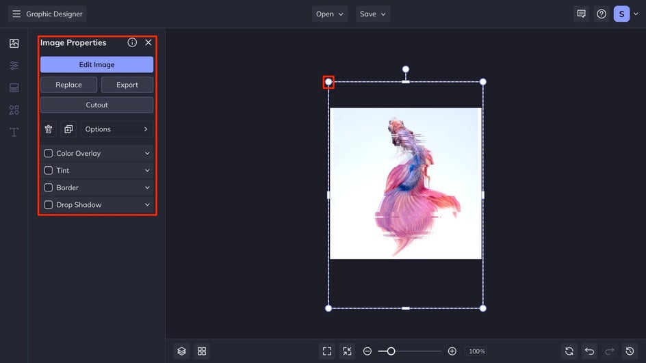 When you select a graphic that has been dropped onto your canvas, the Graphic Properties menu will populate. Here you can change the color of your graphics and make other changes to your graphics.