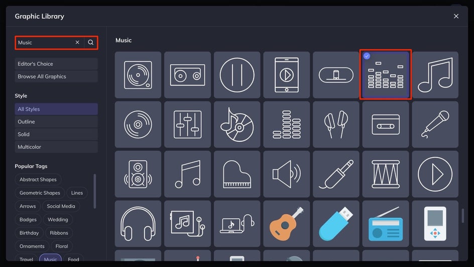 Under the Graphics tab, click the Search Graphics button to explore our extensive Graphics Library for the right fit for your playlist cover.