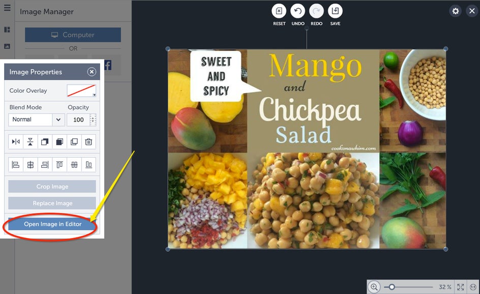Next, you’ll want to swap out your template’s existing imagery with photos representing the recipe you’ll be promoting. To do this, click on the image you wish to replace, then click Replace from the Image Properties panel. This will allow you to select the image straight from your computer’s files.
