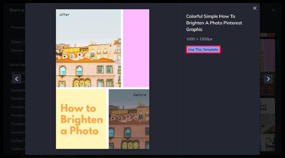 In the Graphic Designer, you’ll find plenty of pre-designed Pinterest Pin templates to choose from, all of which are super easy to edit. Click on the design that takes your fancy, then click Use This Template to begin editing it.