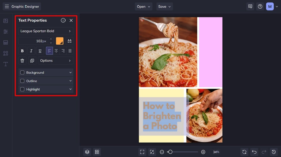 Once your recipe’s imagery is in place, it’s time to edit the existing text to reflect its unique details. You can change what any text says by double-clicking on the text box and typing. When you click on any text box, a Text Properties panel also appears, where you can change elements such as font family, font size, spacing, paragraph, color, and more.