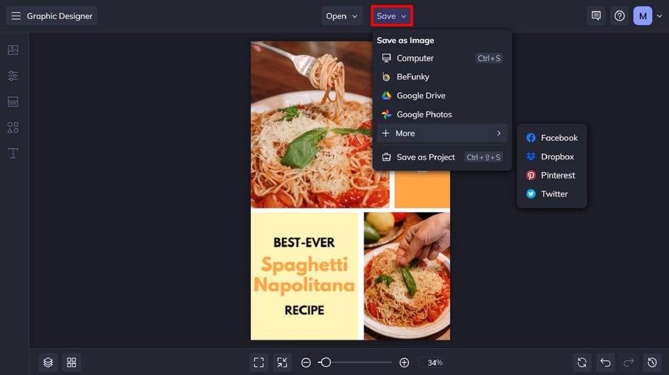Once your recipe Rich Pin is complete, it’s time to save it. Click Save at the top of the screen, then select your desired destination. You can even upload it directly to Pinterest from within the Designer. Just navigate to More, followed by Pinterest.