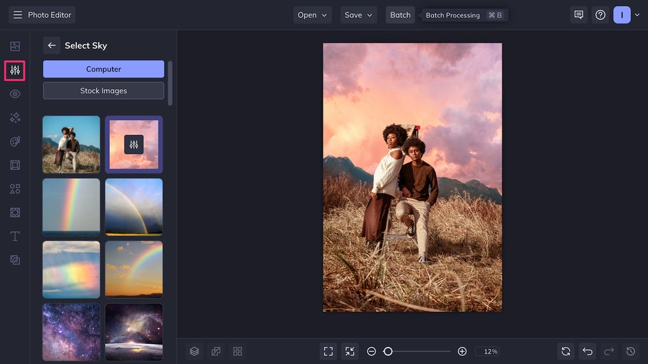 This is a particularly great feature for businesses that rely on outdoor content, like travel and hospitality, but it’s also a good choice for clothing, makeup and food brands that use creative product photography. Instead of relying on happenstance for a bright blue sky or dreamy sunset glow, you can create the perfect backdrop yourself right in the Photo Editor.
