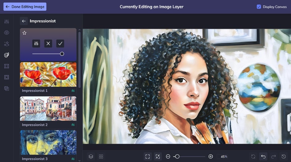 If your brand leans more artistic or refined, try turning your imagery into handcrafted art with our photo to painting effects. You can choose from a range of painting styles, from classic oil paintings to dreamy watercolor and Impressionist effects.