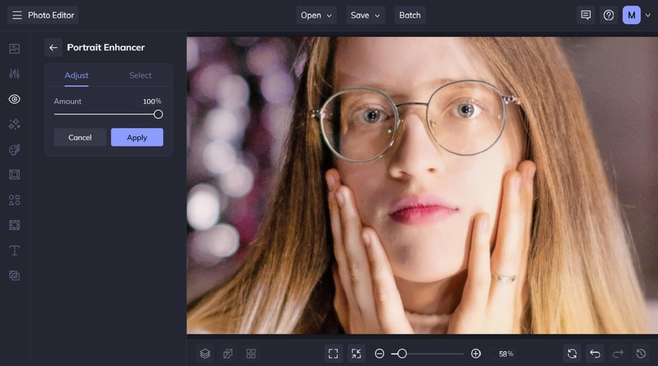 If your banner includes a photo of yourself – like a YouTube channel header, LinkedIn banner, or personal brand website banner – you’ll want to put your best foot (or rather, face) forward. Our Portrait Enhancer is ideal for smoothing skin, brightening eyes, and adjusting lighting, ensuring that your photo looks polished and professional without looking over-edited.