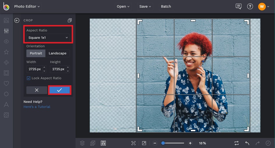 First up, we’re going to crop our bio photo to make it centered. Click on the Crop tool in the menu on the left and use it to crop your bio photo to any Aspect Ratio or select Freeform to simply drag the corners in or out until you’ve reached your desired crop. Then, just click the blue checkmark to apply.