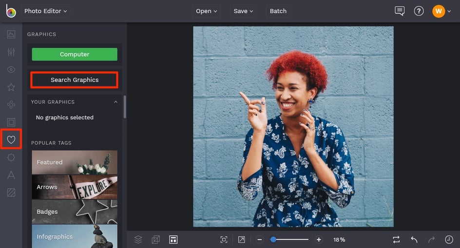Next, we’re going to add some fun graphics into our bio photo to ramp-up its creativity factor. Select the Graphics tab from the side menu (the heart symbol). You can upload graphics from your Computer or click the Search Graphics button to browse over five thousand vector graphics and icons.