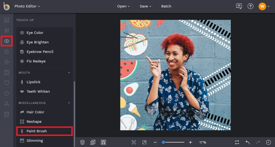 If you’d prefer to add in some hand drawn elements or paint some lines in by hand, then navigate to the Touch Up tab in the side menu and click on Paint Brush. From here, you can select which color you want to paint, as well as elements such as Blend Mode, Opacity, Strength, Brush Size, and Brush Hardness. After adjusting your options, simply click and drag with your mouse to paint on your photo.