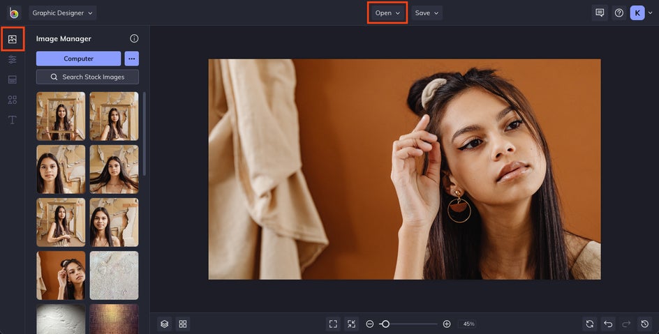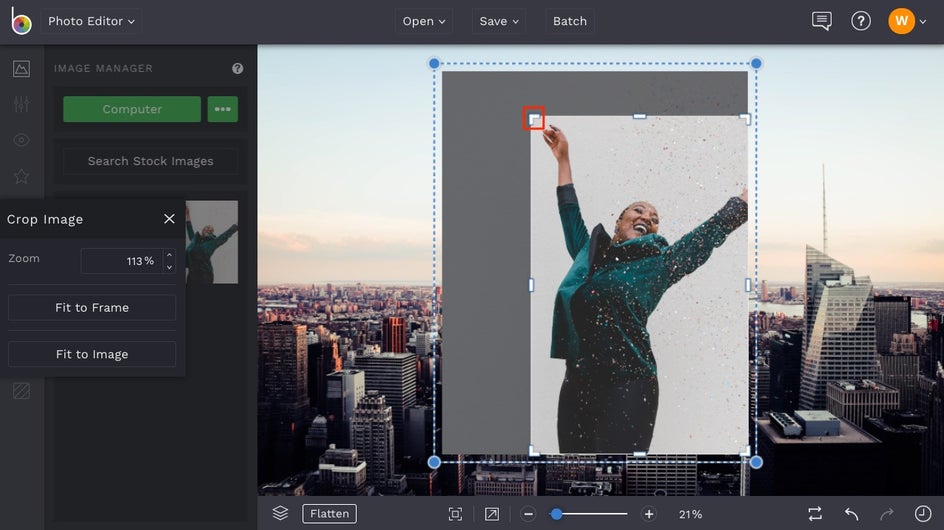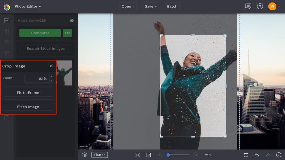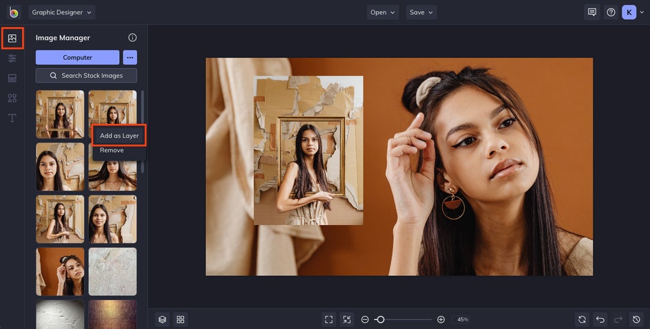When you’re in the Image Manager, you can use the light blue Computer button to upload images directly from your computer. You can also click the three dots next to it to pull from a connected account. Alternatively, click Search Stock Images to access BeFunky’s enormous image library. Or, drag and drop images directly to your Image Manager and see them available to be added as layers.