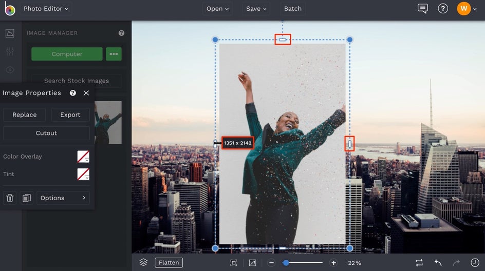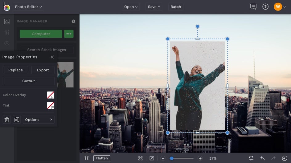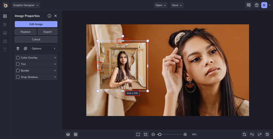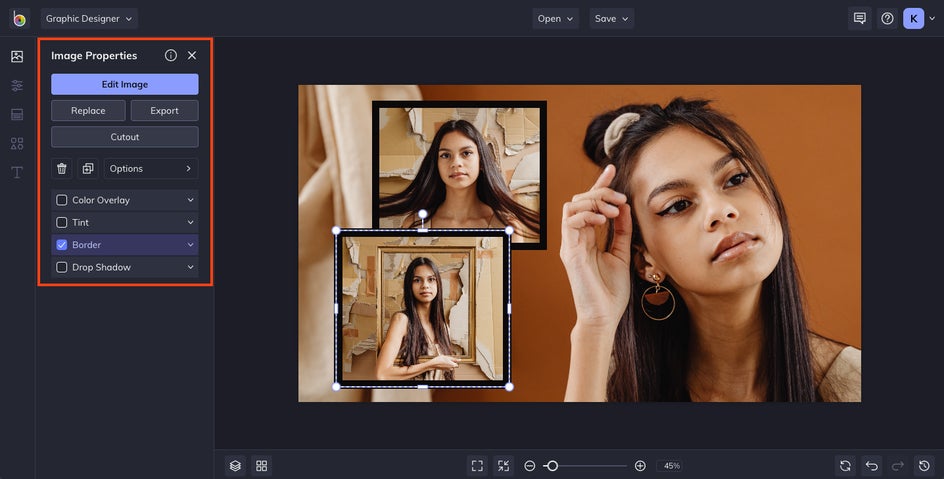 From here, you can click and drag the layer around to reposition it, add more layers, or use the Image Properties menu to make further edits. Add borders to create a distinct look between a layer and the background. Add a color overlay or tint to adjust the mood of an image. You can also click on Edit Image to open the layer separately in the Photo Editor and make individual edits.
