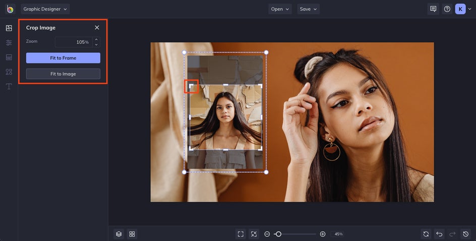 Use the Crop Image menu that appears in your left-hand menu to zoom in to the layer or reposition the crop target to your liking. Select Fit to Frame to fit the crop target within the frame of the layer, or Fit to Image to reset the crop target and surround it with the layer’s original dimensions.
