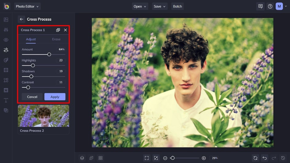 Within the Effects tab, simply click on Cross Process to view these photo effects.