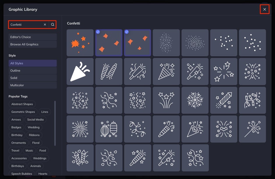 Simply search for the graphic you want, click it, and it will be automatically added to Your Graphics. When you are done selecting your design elements, exit out of the screen in the top right corner.