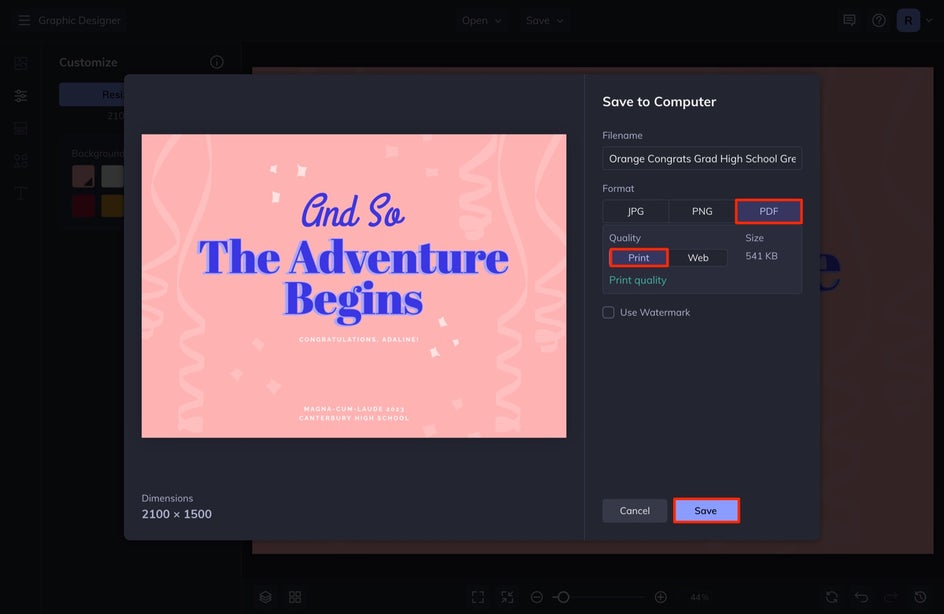If you are sending this as a digital card, you can simply save it as a JPG. If you want to send this as a physical card, select Computer and then save this as a printable PDF, and make sure that the Print tab is selected. When you are finished with your settings, select the Save button.