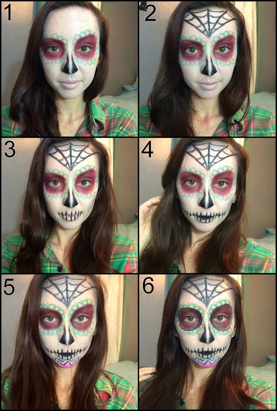 - Using a white paint, cover your entire face and lips in a thin layer. Add a burgundy eye shadow in large circles around the eyes, and smaller circles with green paint surrounding each one. Create the skeletal look by adding black in a triangle shape to either side of your nose.
