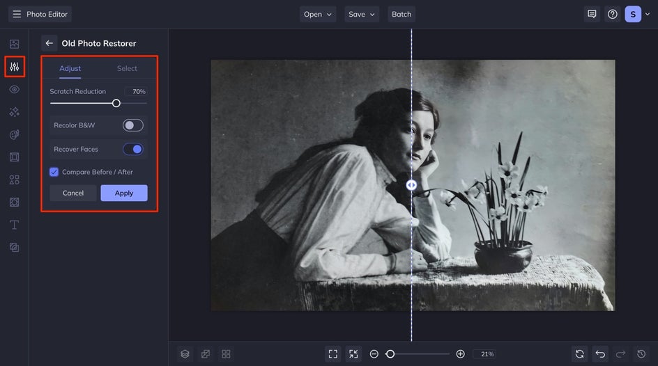 The Old Photo Restorer will automatically restore your old image – removing any noise in the process. You can make adjustments in the menu on the left side of your image. You can adjust how much of the effect is applied with the slider. After you are satisfied with the result of your restored photo, click the Apply button.
