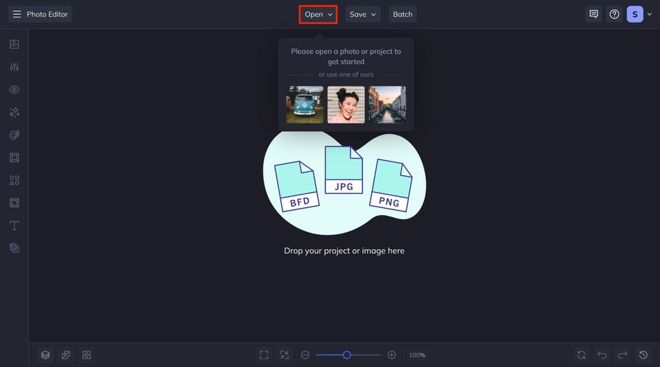 From the Old Photo Restorer, upload your photo by clicking Open at the top of your canvas, or drag and drop your image into your canvas.