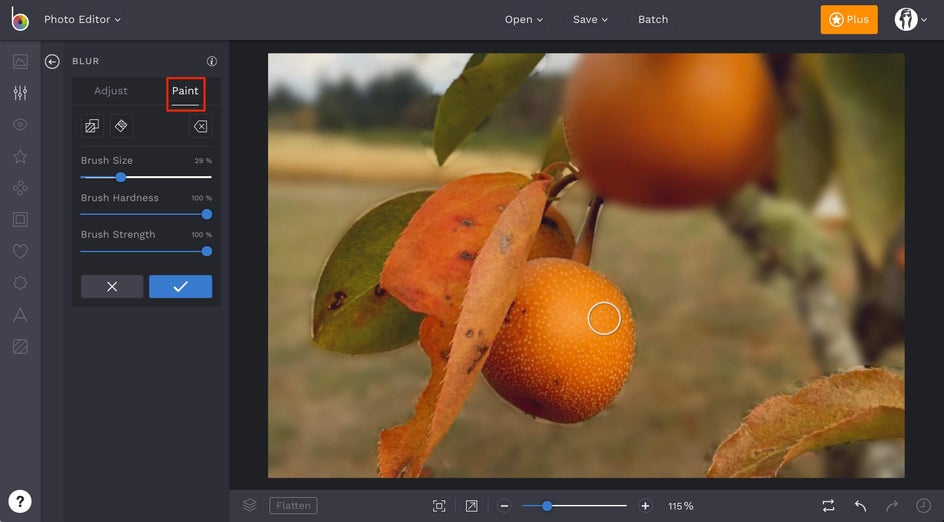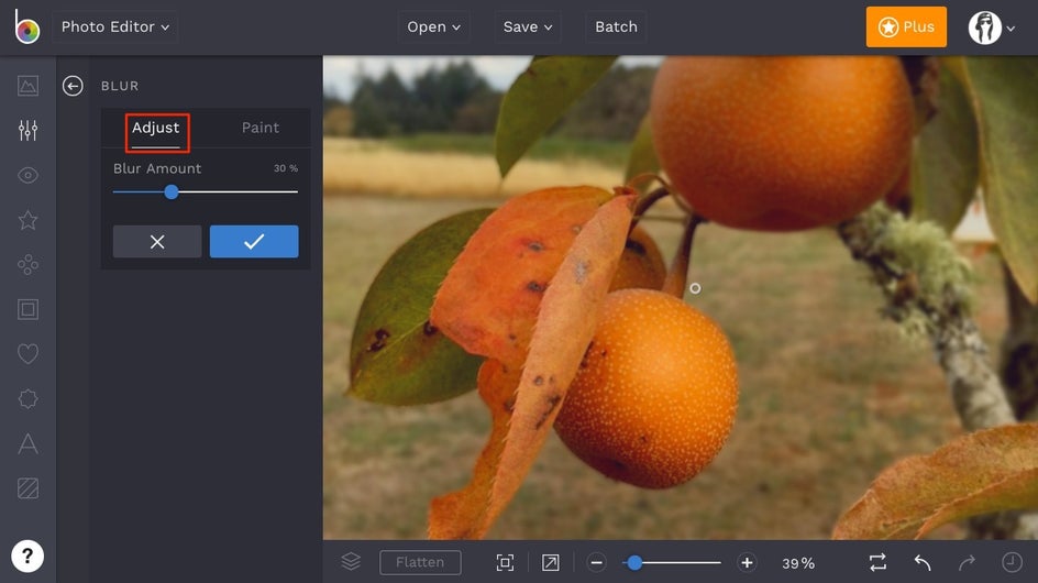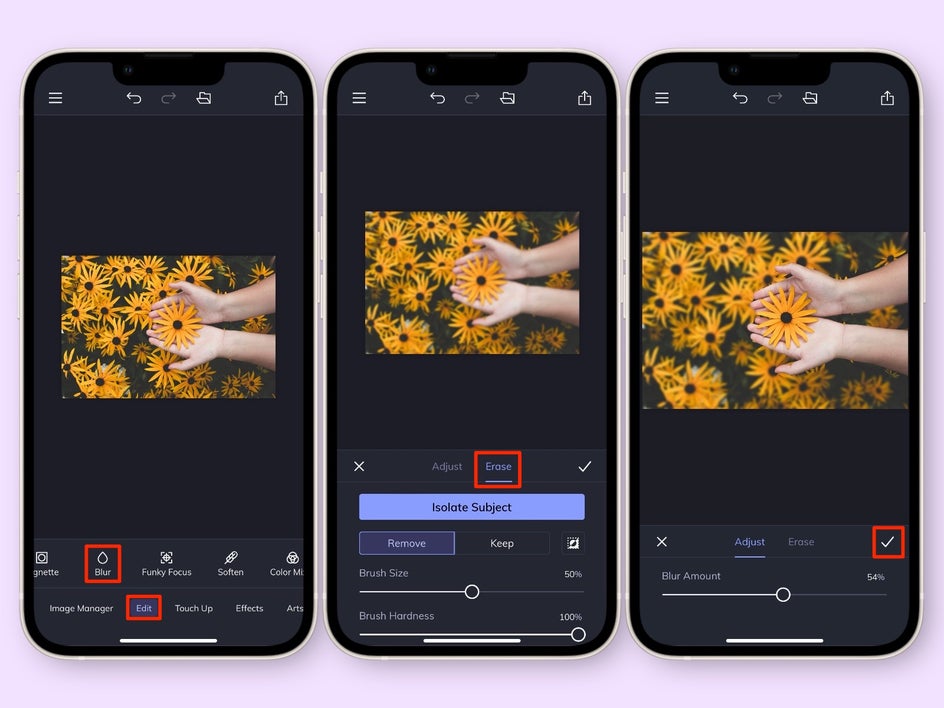 The Blur tool is a great way to be more selective about what areas are blurred and which are not, giving you total control over your depth of field. When you select Blur it will automatically have the entire canvas covered in the blur. To remove the blur from some regions of the image, switch to Erase mode and you will be able to make adjustments to the brush size, and the hardness and strength of the brush. Within the mobile app, you simply swipe your finger over the areas that you want the blur removed from. You could even use the Isolate Subject button to have BeFunky’s A.I. technology locate your subject within the image and remove the blur. You can toggle back over to the Adjust section, and use the slider to adjust how intense the blur is on the background of your image; this creates your depth of field. After you are satisfied with your results, click the Apply button on desktop, or the checkmark on the mobile app.