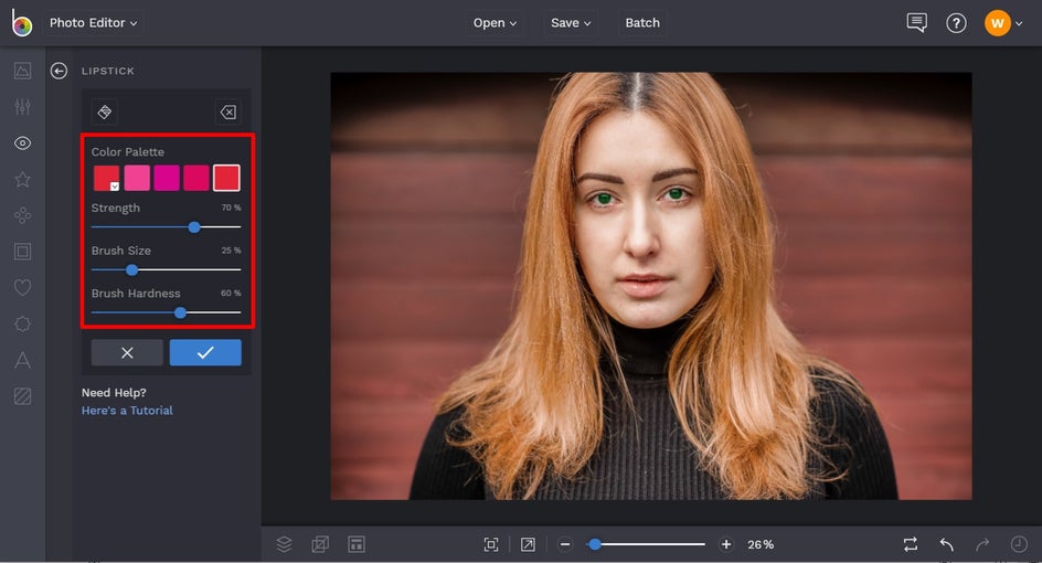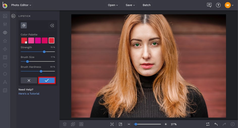 With the Touch Up tools, lipstick application is a breeze. Just brush the color onto the lips and use the Erase tool if you accidentally go outside the lip line. Unlike in real life, there will be no smudge marks! Don’t forget to Apply to save your changes.
