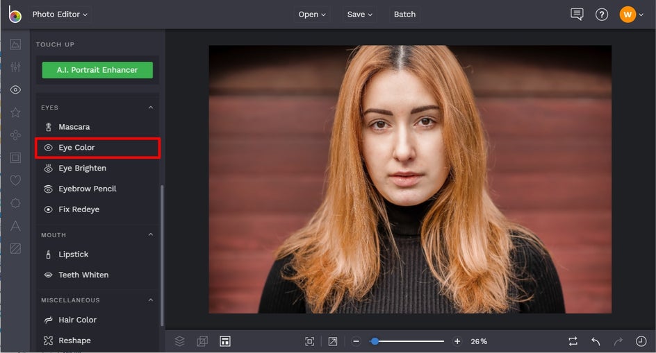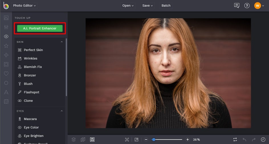 To get started on your digital makeover, head to the Touch Up tab in the Photo Editor and open the portrait you’d like to transform. For a quick fix, all you have to do is click the blue AI Portrait Enhancer button at the top of the screen.