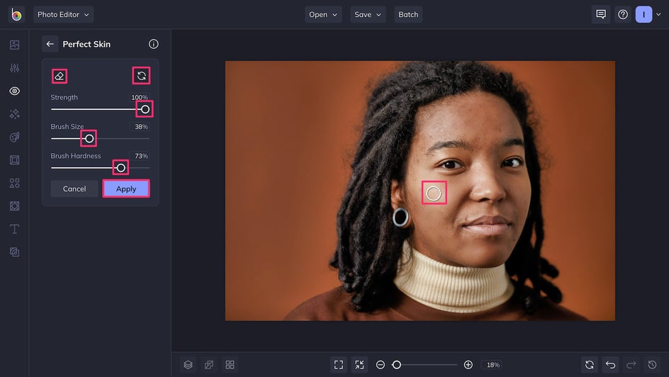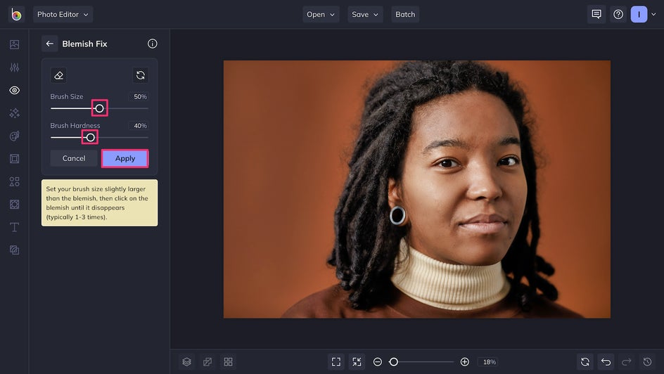 With the Brush Size slider, you can use a bigger brush for large areas and a smaller one for detailing. Decrease the Brush Hardness slider to give your changes a softer edge. You can change the strength of Blemish Fix at any time to adjust the intensity of the effect.