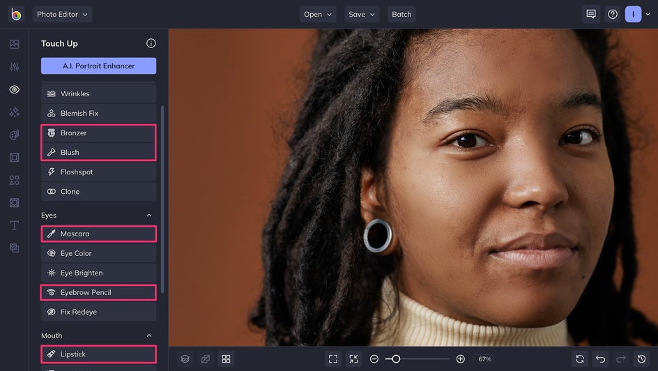 These three problems might seem unrelated, but they all have the same solution: BeFunky’s Touch Up tools and the AI Portrait Enhancer. You can use these tools together to mess around with a new look, enhance a selfie, edit a professional headshot, and more. No professional photo editing skills needed!