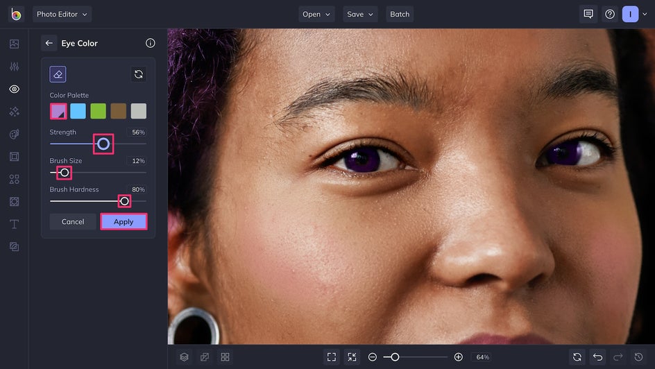 Speaking of colors, your opportunities for transformation aren’t limited to makeup. Even your hair and eye color can be changed! This can completely revamp your look for a new profile photo, or you can use it to try out some unique styles without having to permanently commit to them. Here, we changed our subject’s hair to a bold purple by going over it with a few swipes of the Hair Color brush: