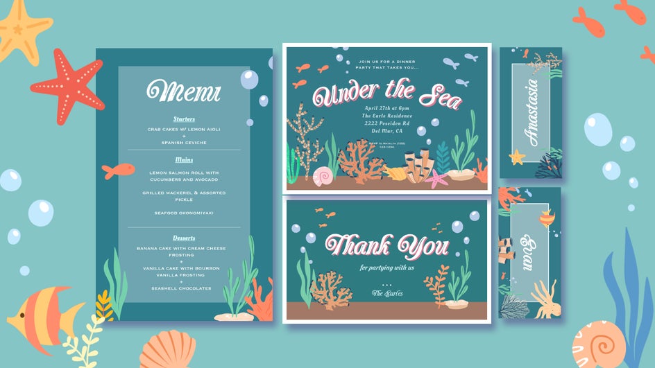 We’re starting with invitations, so we’ve looked up “Party Invitation.” It doesn’t have to fit your party perfectly – yet. You can always adjust the colors and design elements once you’ve chosen your template. Here’s the one we’ve chosen for our Under the Sea-themed dinner party!