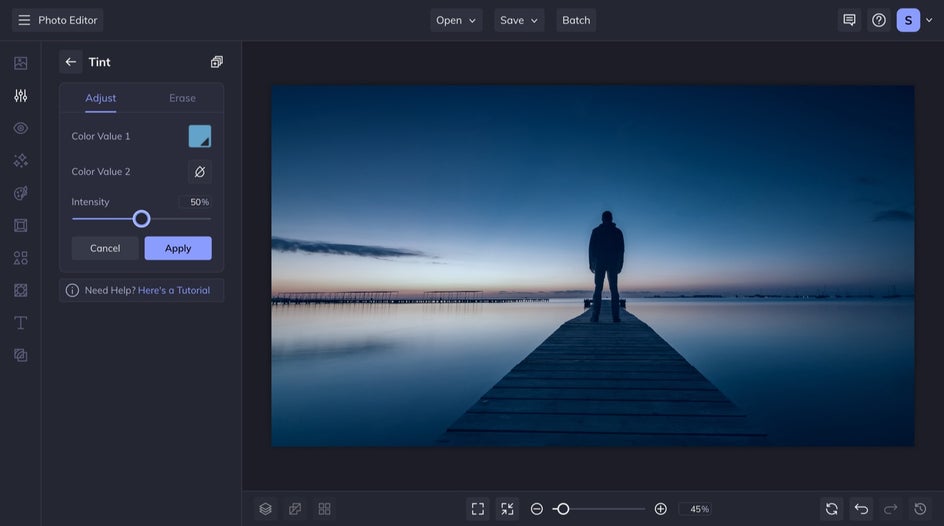 You could also use the Tint tool found under the Edit tab to create a blue hour tint! Choose a blue you like in the Color Value 1 picker, and then adjust the intensity until you have reached your desired outcome. Keep the Color Value 2 empty so that your original photo's detail isn't washed out by the tint.