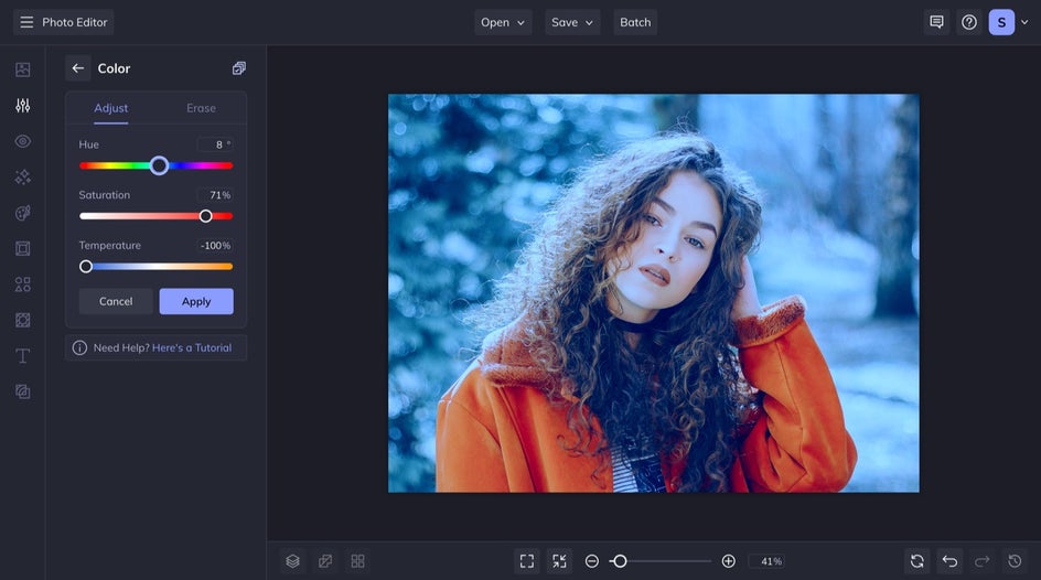 If you have snapped a blue hour photo but you want to enhance it, there are some things you can do in BeFunky’s Photo Editor to make it shine. Under the Edit tab, head to the Color section. Here you will drop your temperature slider down toward the blue end, then you will turn your saturation to about 70%, and adjust your hue until you reach your desired outcome.