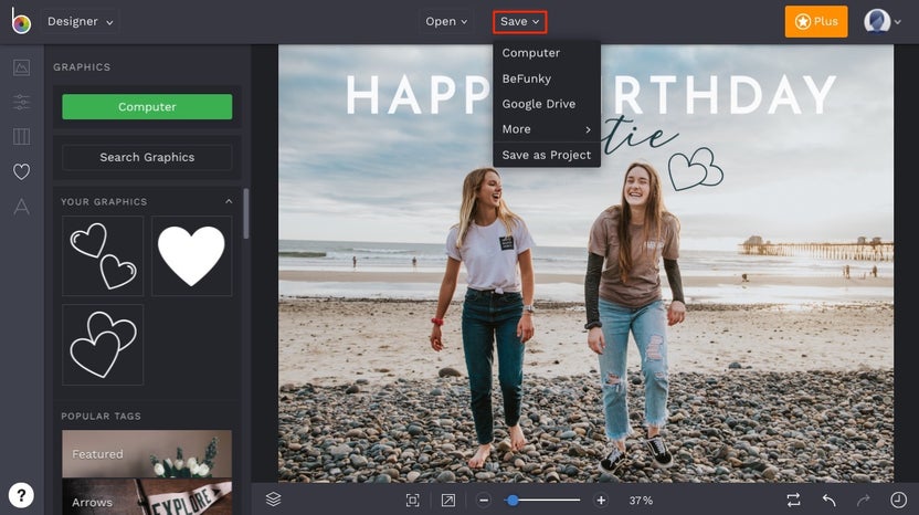Once you’re happy with your custom birthday card design, click Save at the top of the canvas to export it to your device as a high-res PNG for digital sharing or a PDF for printing.