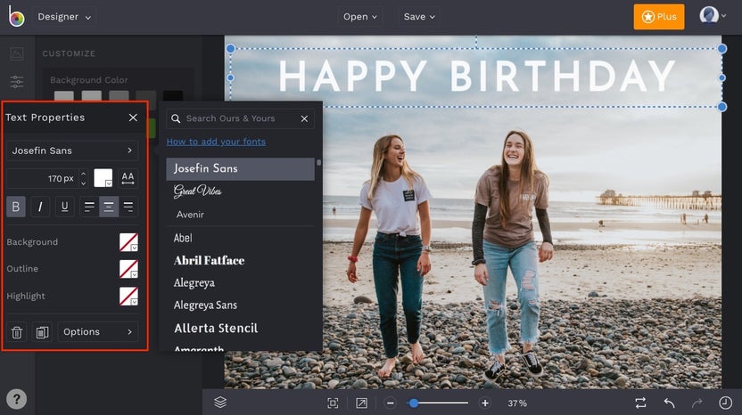 Whether you’re writing a sweet note or a quirky one-liner, it’s super easy to add text to a birthday card with the Text Editor – just click on any of the text areas to edit your birthday message and font. Choose from dozens of different typefaces to fit your card’s aesthetic.