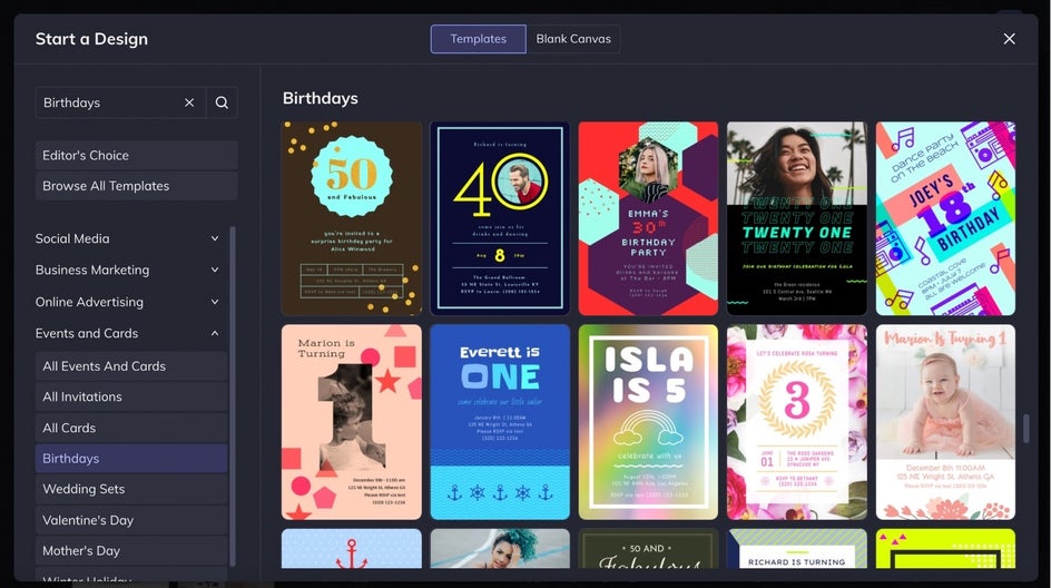 In addition to invites, BeFunky also offers templates for birthday cards, menus, and thank you cards, allowing you to plan the perfect birthday party from start to finish. You can even create a birthday collage and use it as party decor – perfect for milestone birthdays! Alternatively, if you’re hosting an event that’s not birthday-related, the Invitation Maker also offers invite templates for graduations, baby showers, weddings, and more.