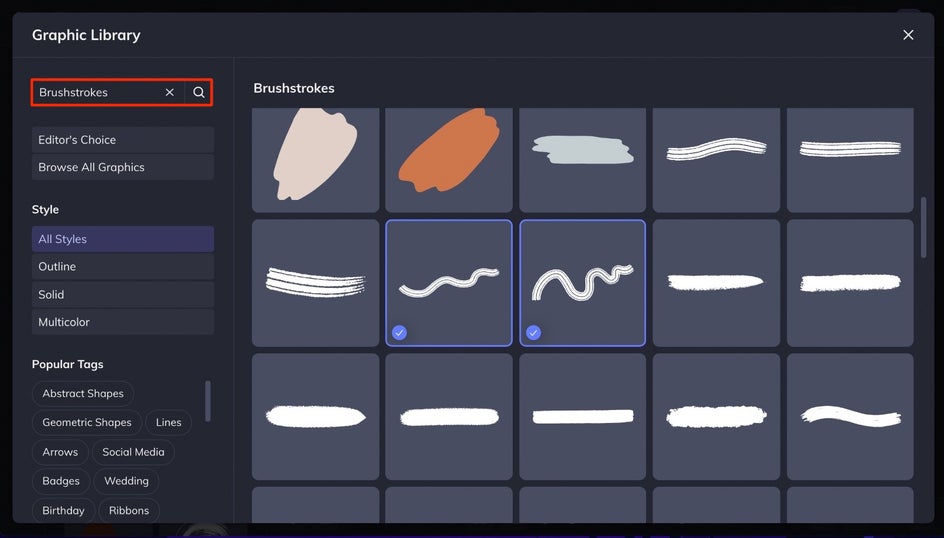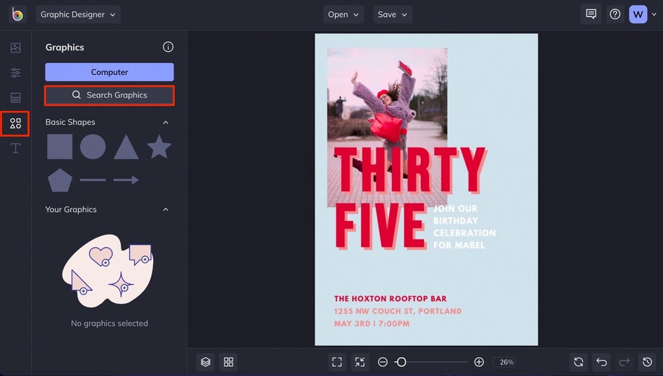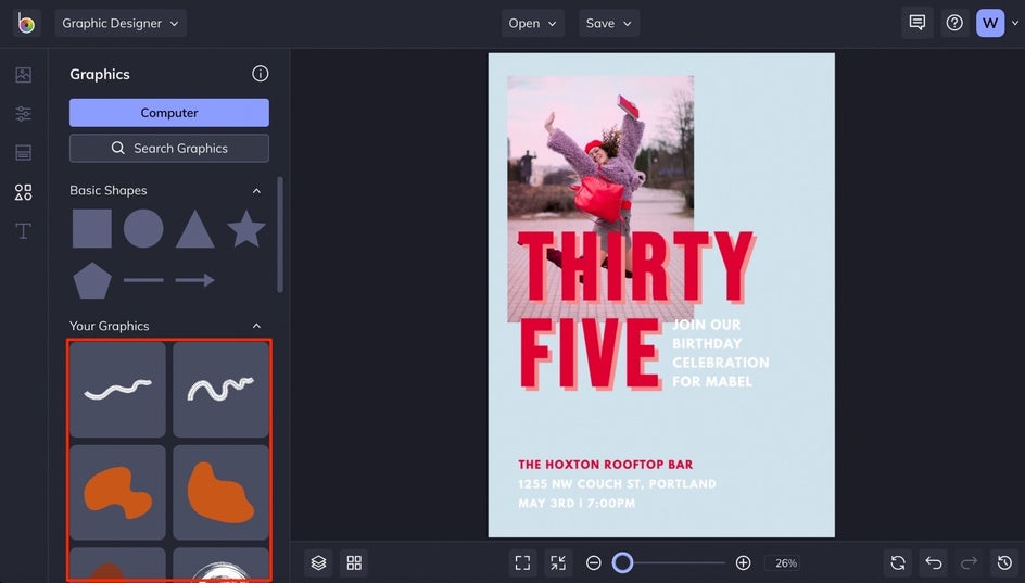 Now it’s time to really get in the DIY spirit and add some hand-drawn vector illustrations from the enormous Graphics Library. Use the Search Bar function to find the perfect graphics for your party theme!