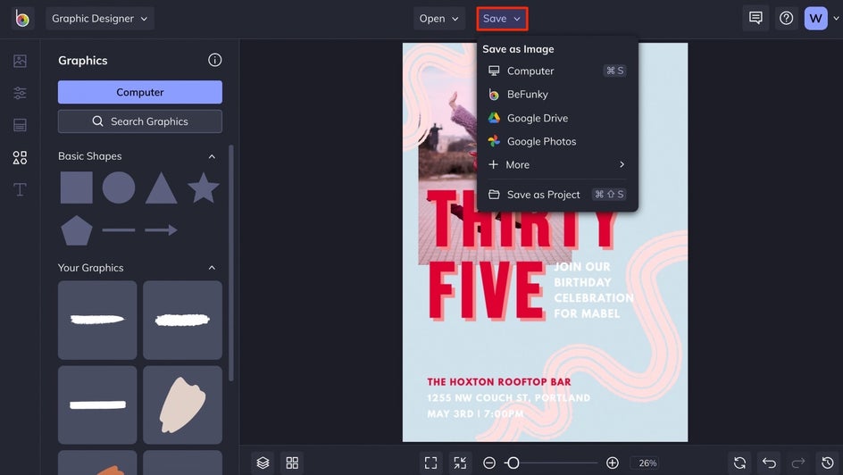 Finally, it’s time to Save your invitation by clicking the button at the top of the canvas. Export the file as a high-quality PNG for digital use or a print-quality PDF for printing – you can even print directly through Zazzle, our integrated printing partner, right from the Save menu!