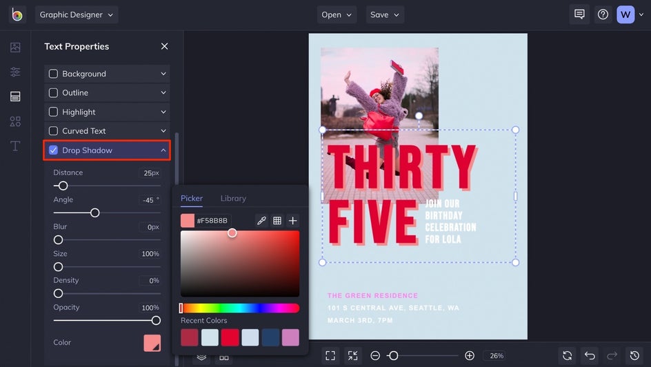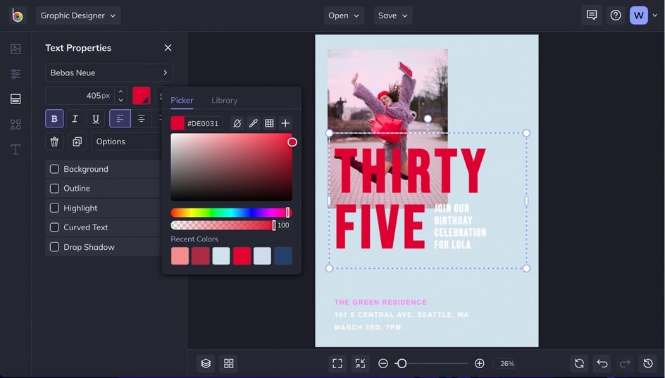 Head over to the Customize tab and change the background color of your birthday party invite. Click on any existing graphics to change their color if needed.