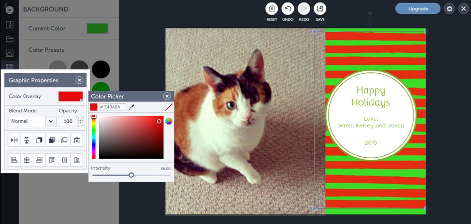 Next, drag and drop your photo onto the template. Choose to open the photo in the Photo Editor, and take a moment to be sure it’s looking its best: edit if necessary. The BeFunky Photo Editor offers various editing elements, including basic options like adjusting contrast, saturation, and sharpening your image along with a whole slew of dazzling filters, graphics and more. Though a cat doesn’t smile with its teeth, your relatives might! Use the Touch up tools to brighten teeth, reduce red-eye, and more!