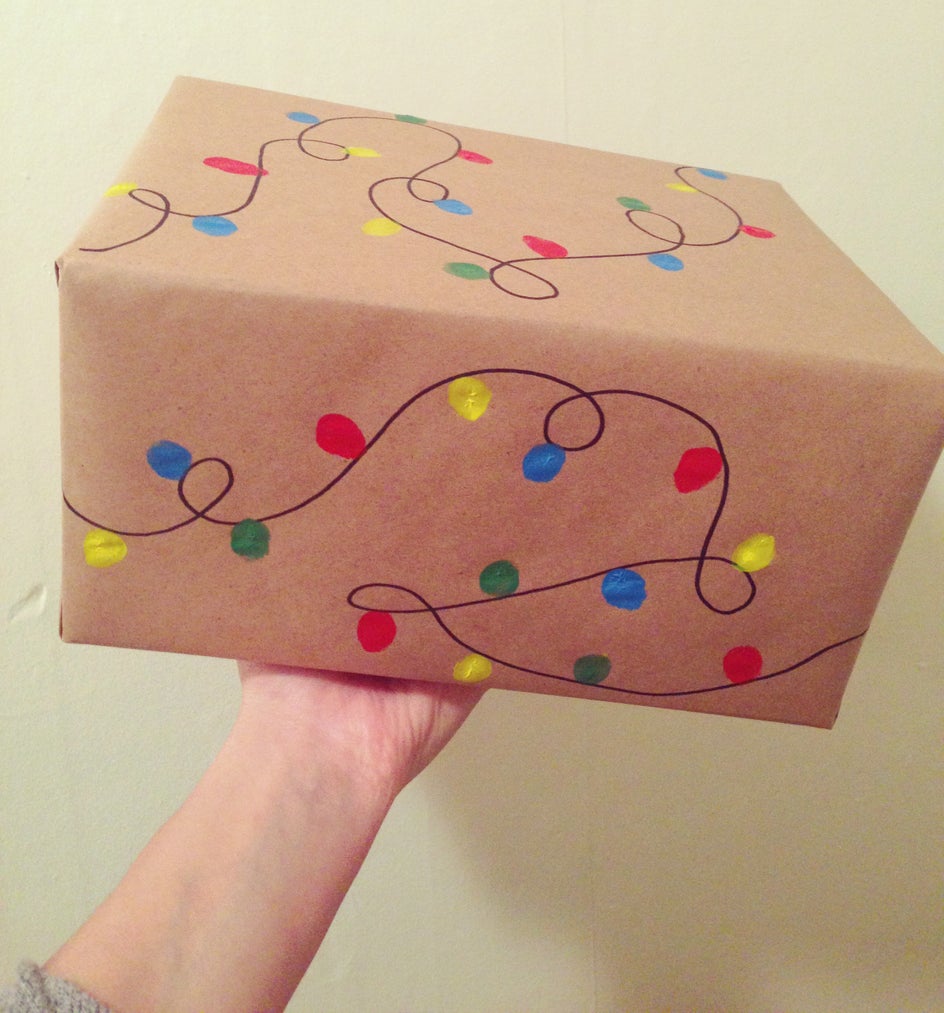 This one is super kid-friendly. In fact, if you’ve got little ones it would be the cutest thing ever to have them finger paint the Christmas lights. Basically, draw a cord with a Sharpie and finger paint the lights with acrylic paint.