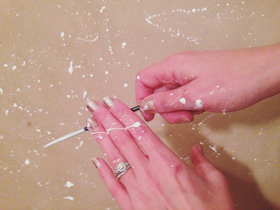Start with some acrylic white paint, water, and a paintbrush. You’ll also want to lay some newspaper or plastic down because the splattering can get a bit messy. Water down the paint to splattering consistency and splatter the paint onto brown shipping paper.